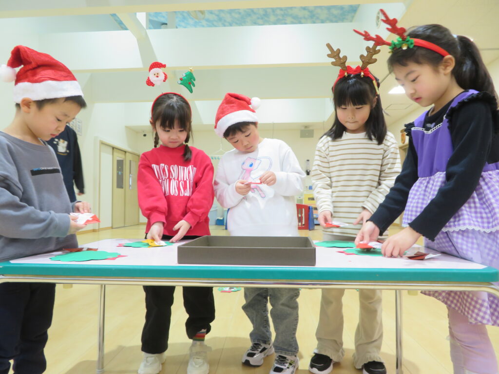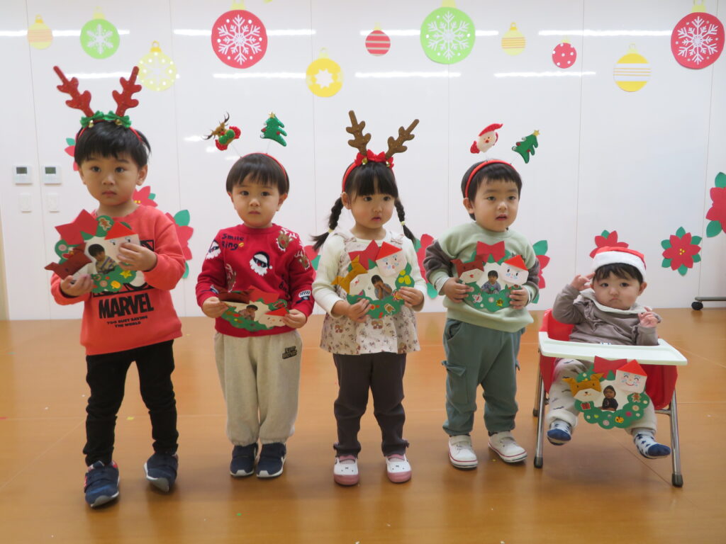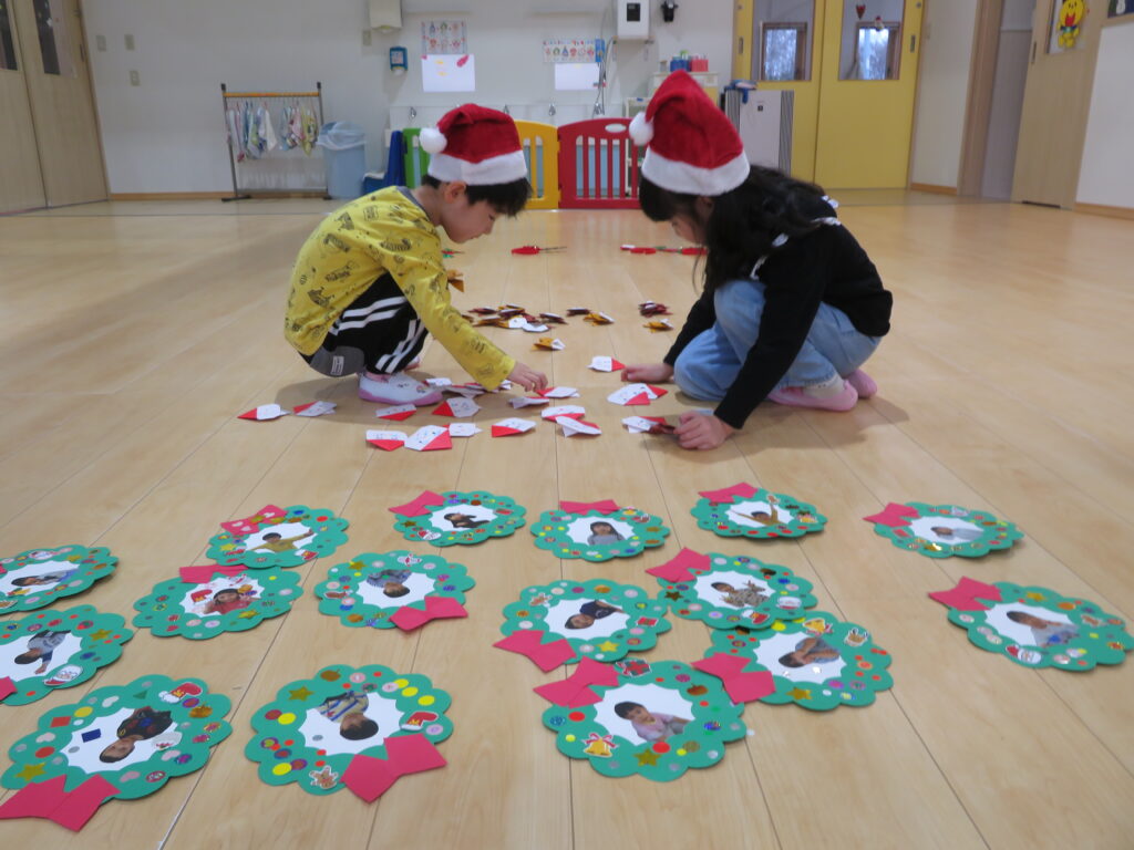 クリスマス会では、自分の写真がついた、クリスマスリース作りをしました♪