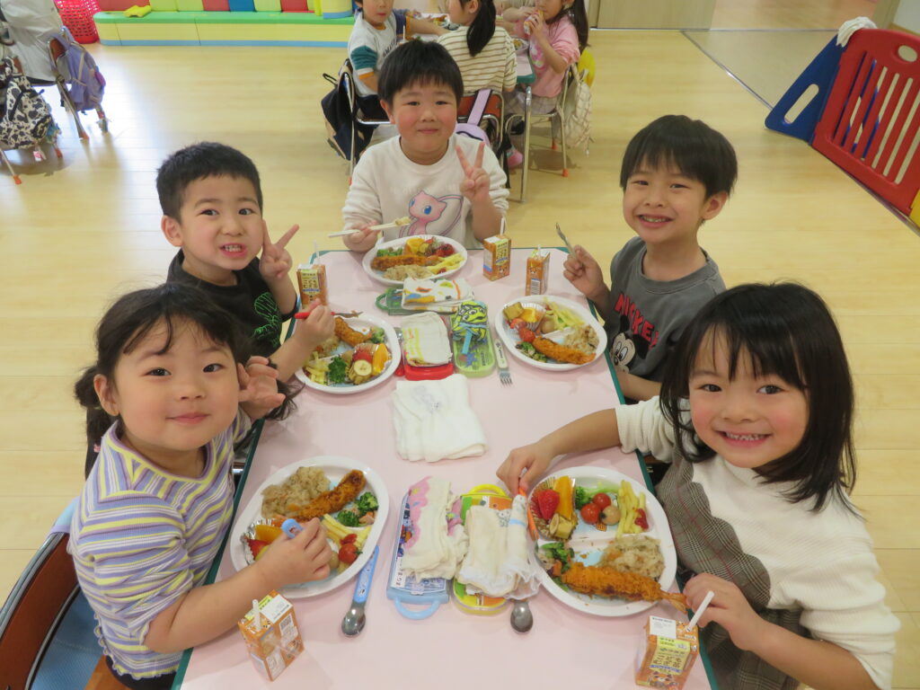 炊き込みご飯と、おおきなエビフライと、ポテト、オレンジが特に大人気でした♡(^_-)-☆